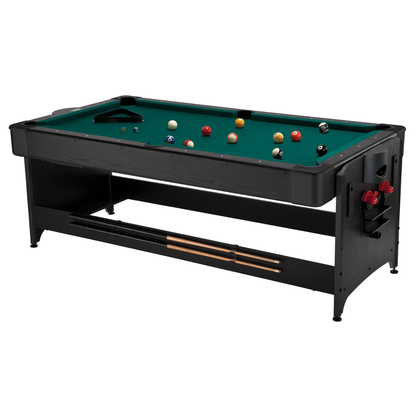 Fat Cat 3-in-1 game table make changing games a quick and easy. Just unlock the convenient latches and flip it. For storage, it can also be locked upright.