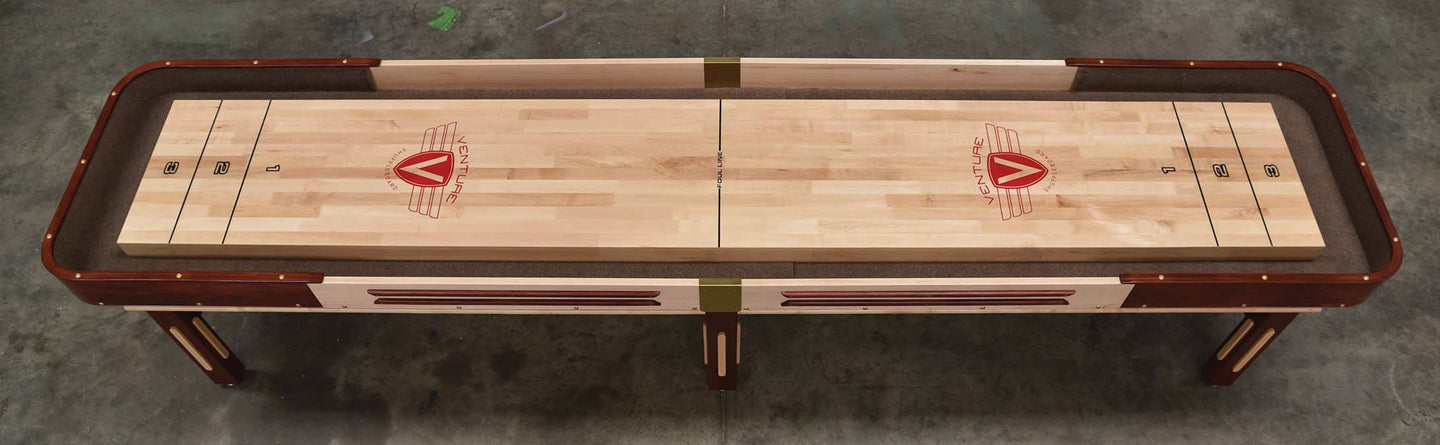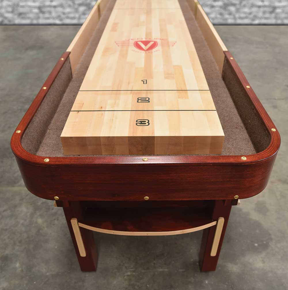 The onlay detail of clear maple on both the legs and cabinet adds to the Empire Style and traditional feel of the shuffleboard table.