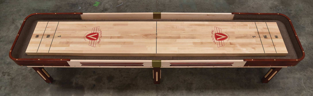 - 3″ thick X 20″ wide pro playing surface, coated with Venture Shuffleboard’s exclusive hard clear synthetic lacquer