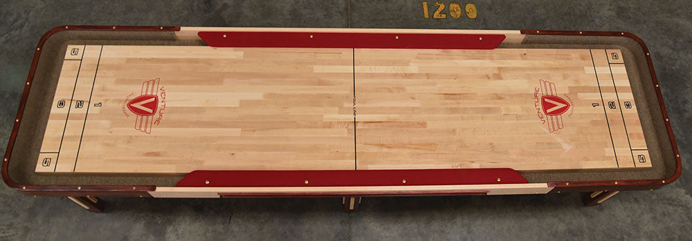 Overhead view of the Venture Grand Deluxe Cushion 12' Shuffleboard Table with red markings.