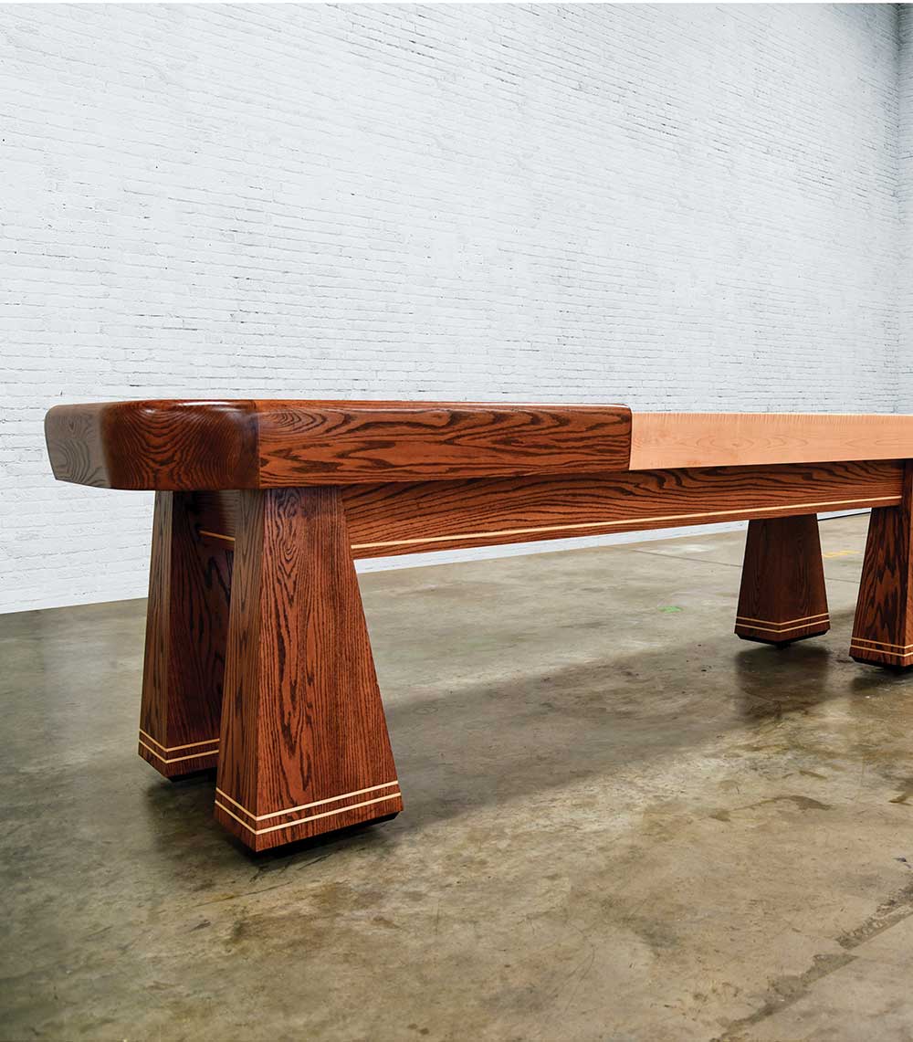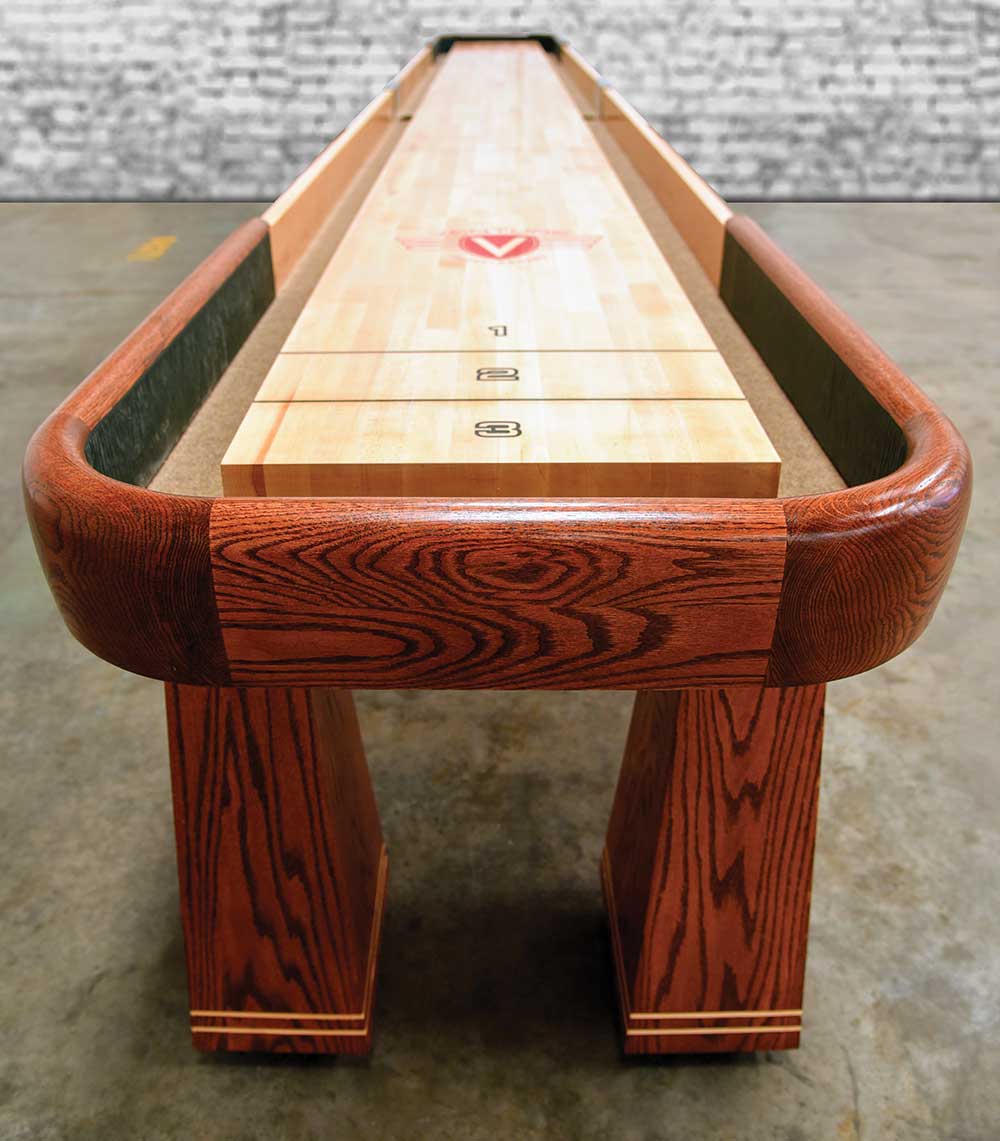 Custom Chestnut stained tear drop horse collars with 6/4 Curly Maple side rails are the center of the Saratoga Shuffleboard.