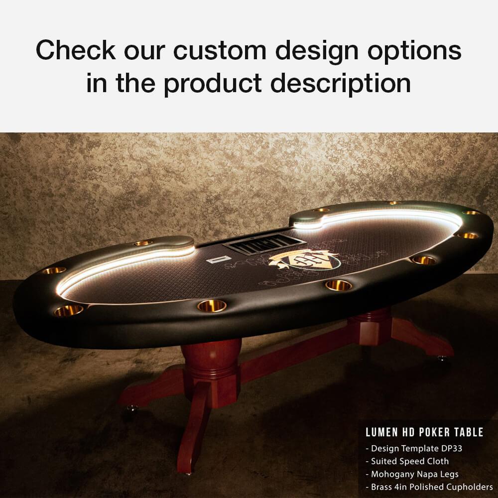 This fully customizable table can make your poker table dreams come true. The Lumen HD is a casino quality poker table that will stand up to endless play and compliments. Can you imagine the ability to change the mood with just the push of a remote? A subtle yet powerful waterproof LED trim can give you just that.
