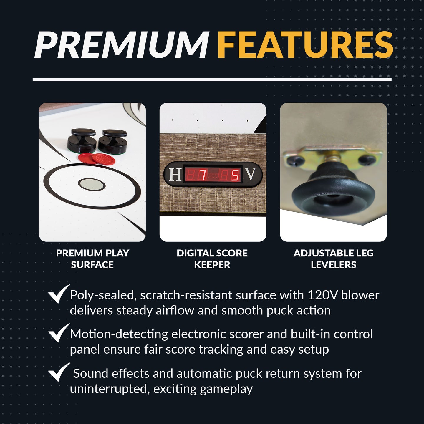- UNIQUE SCORING SYSTEM - An in-rail timer, scoring unit, and control panel track every goal and sound a buzzer when someone scores. Dual goal boxes with automatic puck returns keep the action going.