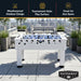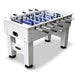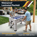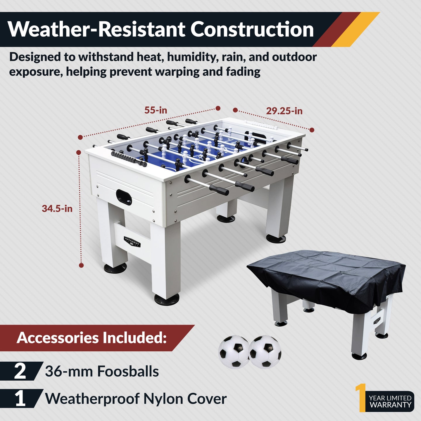 A perfect addition to your patio, pool or yard, this stylish foosball table is loaded with high-quality features. Every component is designed to withstand the elements, including a waterproof frame and rust-proof aluminum rods. Ergonomic handles ensure hours of play without straining your hands. Bring the tournament into your backyard with the Highlander's sturdy, cross-supported surface. This brilliant blue play area blends beautifully with a glossy white cabinet, creating a dazzling look that delights the eyes and elevates the action. The Highlander also comes equipped with integrated leg levelers and a cross-supported surface, ensuring an even playing field. Includes 2- 36mm ABS high quality foosballs and a weather-resistant, nylon cover.