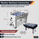 - WEATHER-RESISTANT - Heat and humidity don’t stand a chance against this durable table. Every surface is coated with a protective laminate, including its waterproof surface and weather-resistant cabinet. Sturdy, aluminum rods are built to withstand rust.