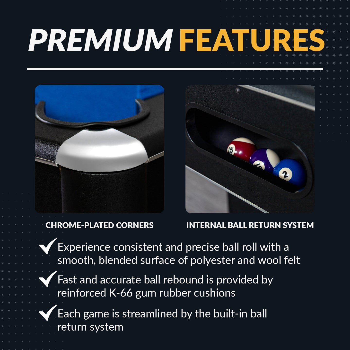 The 3/4-inch MDF playing surface ensures precision, featuring smooth, accurate ball roll on the blended blue felt. Its rugged construction includes a sturdy black cabinet with pedestal-style legs and built-in levelers for perfect stability. The integrated ball return system simplifies re-racking, allowing you to focus on your next shot. Whether executing a tricky corner shot or leaning in for the perfect angle, you'll feel the craftsmanship in every detail.