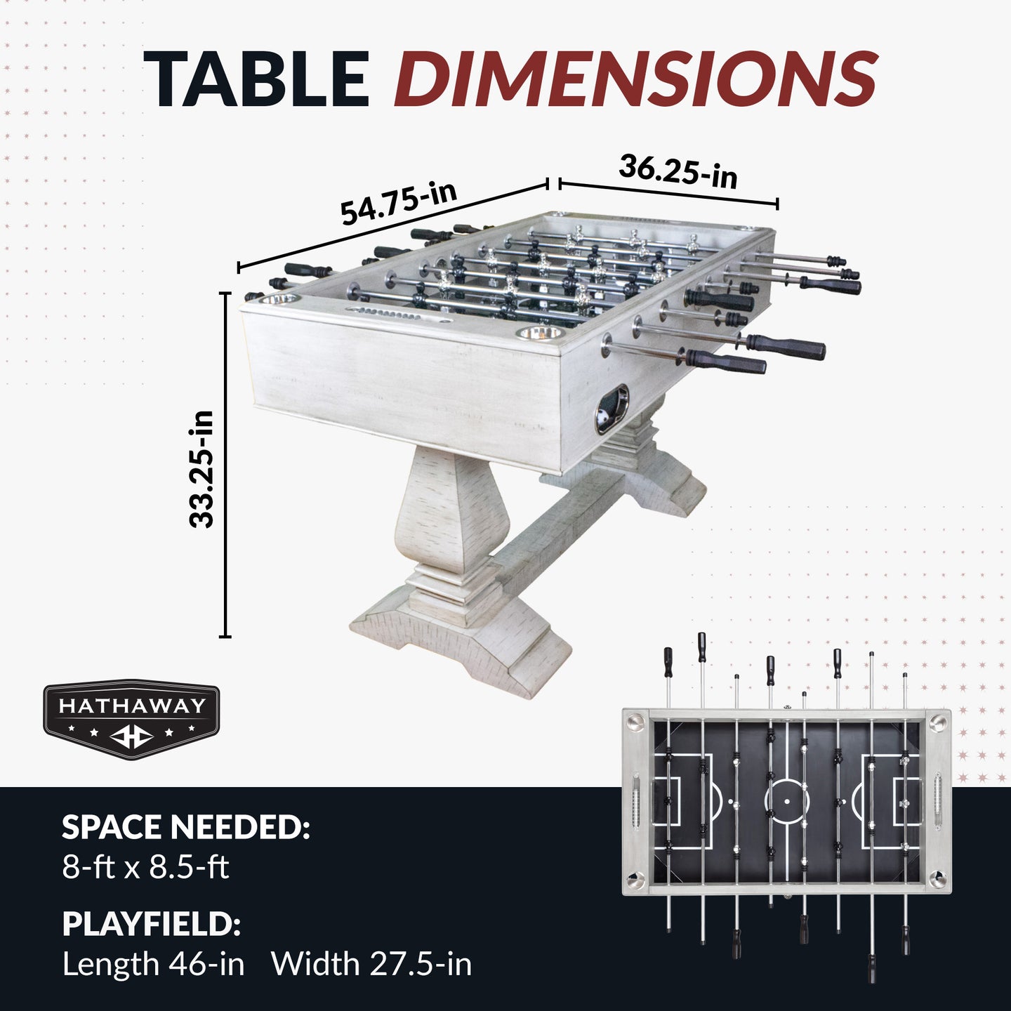 - Playfield Dimensions: 46-in (L) x 27.5-in (W) x 0.7-in (Thick)