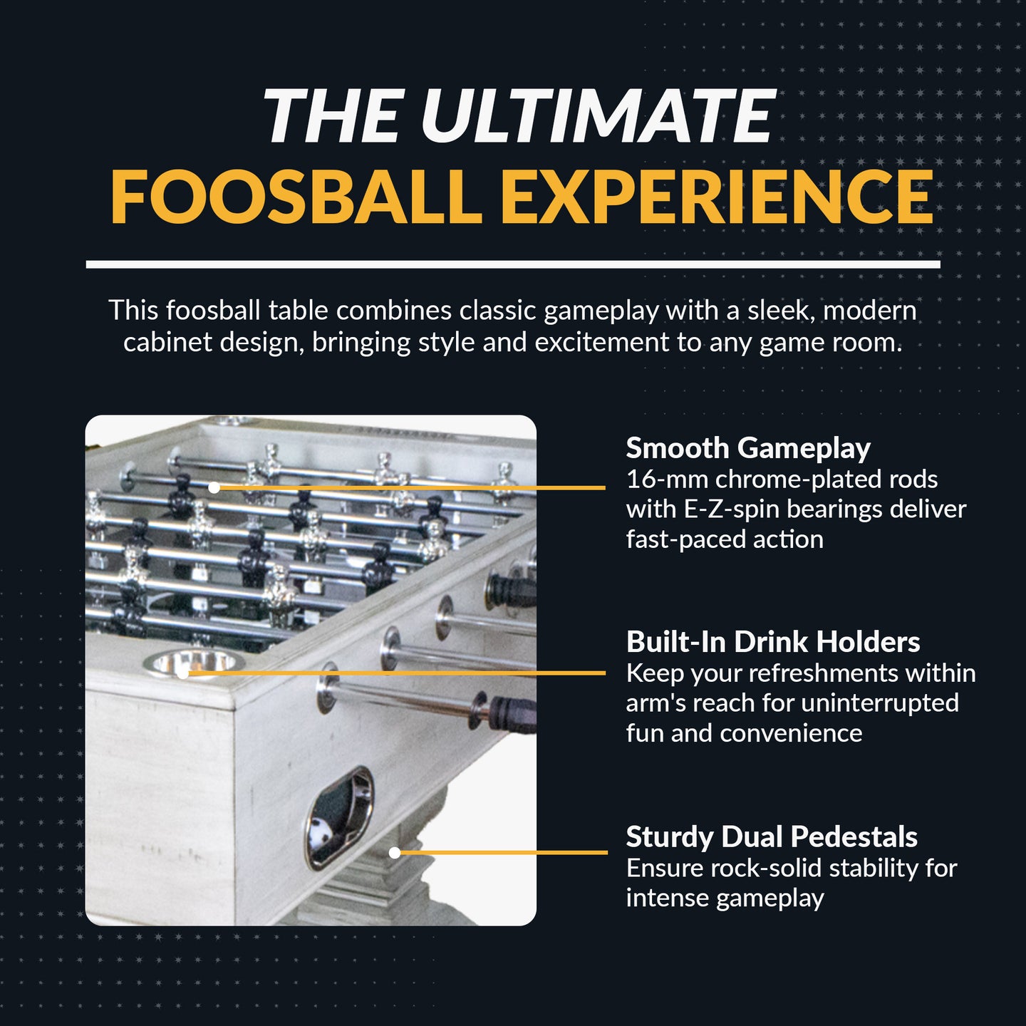 - ROCK-SOLID PLAY - Rigorous play roughs up inferior tables. But with dual pedestals and a center support stretcher, this table stands up to the roughest competition. A cross-supported playfield and integrated leg levelers ensure a level playing field.