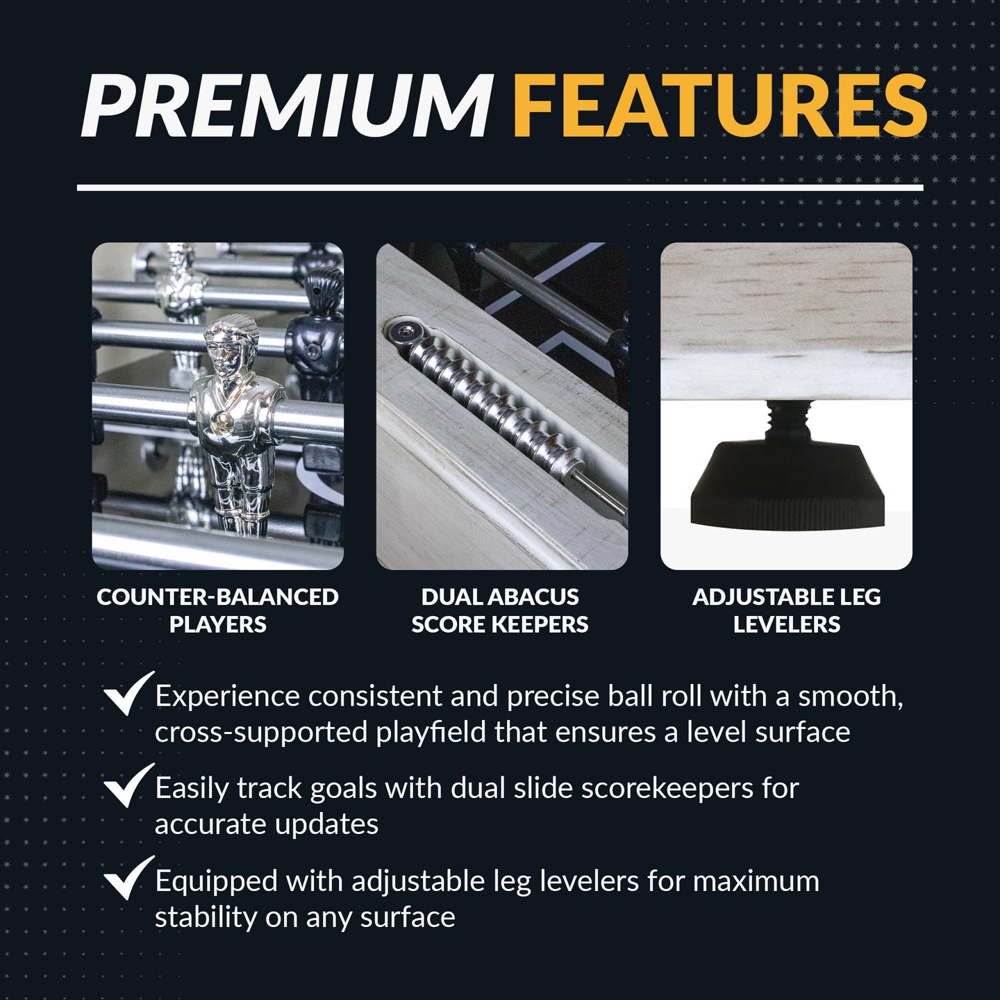 - THE ULTIMATE TEAM - ABS counter-balanced and dimpled players allow for better ball control. Its 3-goalie configuration meets the standard for serious players.