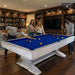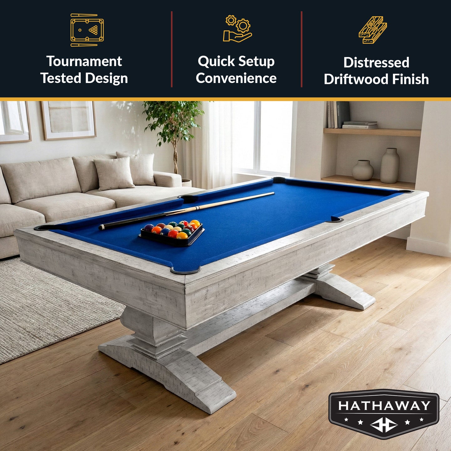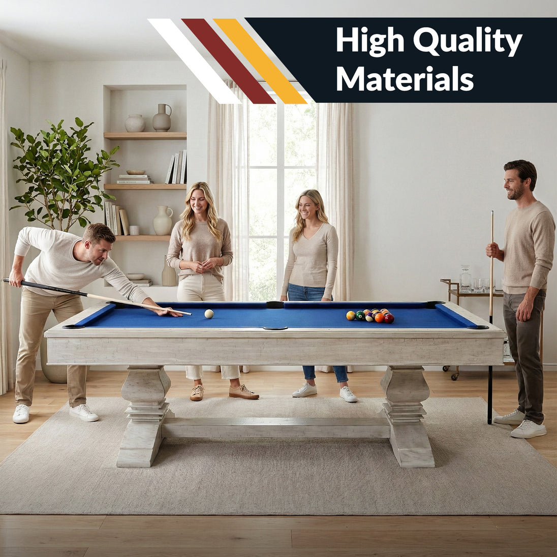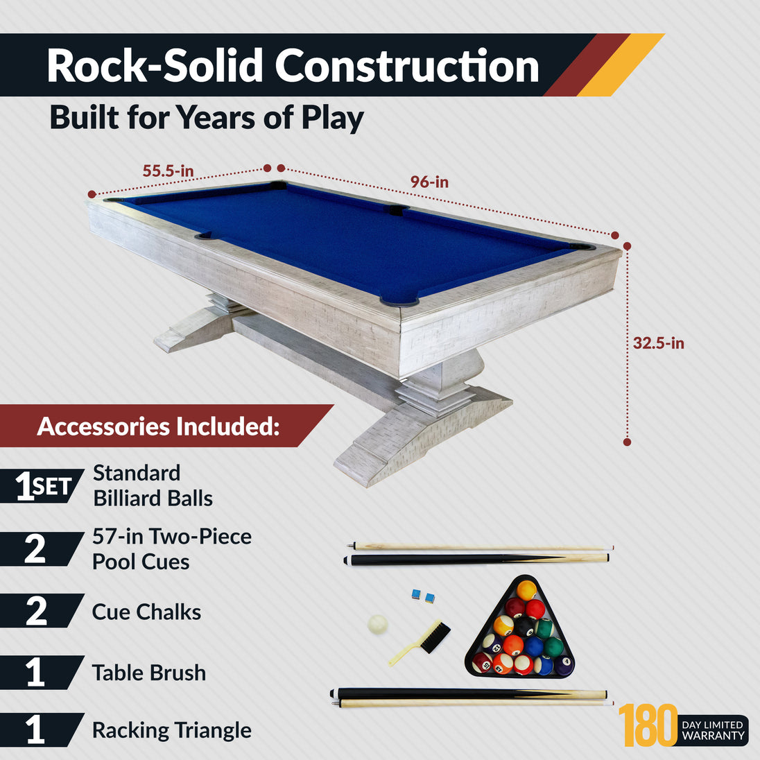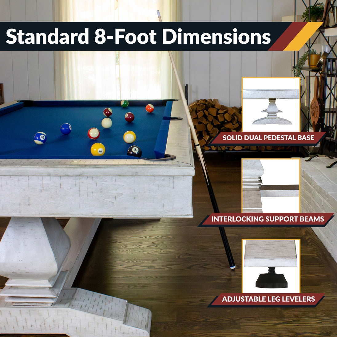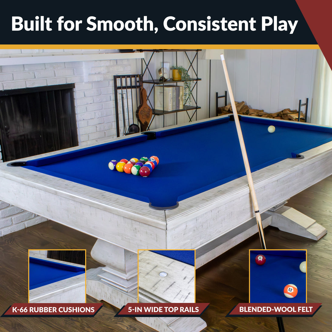 The Montecito pool table will be the showpiece of your game room, den, or office. Its charming finish and sturdy, dual pedestal base captures the character of the modern farmhouse. Enjoy slate-like gaming on a lightweight, easy-to-assemble table. A 1.75-in thick, engineered wood play surface ensures smooth, accurate, warp-free play. Premium, K-66 gum rubber cushions absorb shock and rebound balls with ease. This table plays flat on any surface thanks to independent, integrated leg levelers.