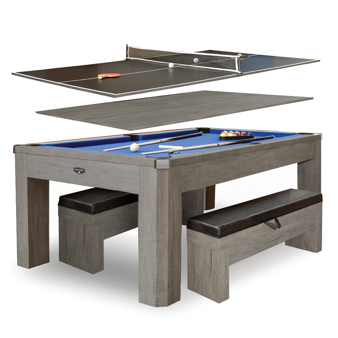 Hathaway Newport 7-ft Pool Table Combo Set with Benches - Rustic Gray with Blue Felt BG50374