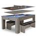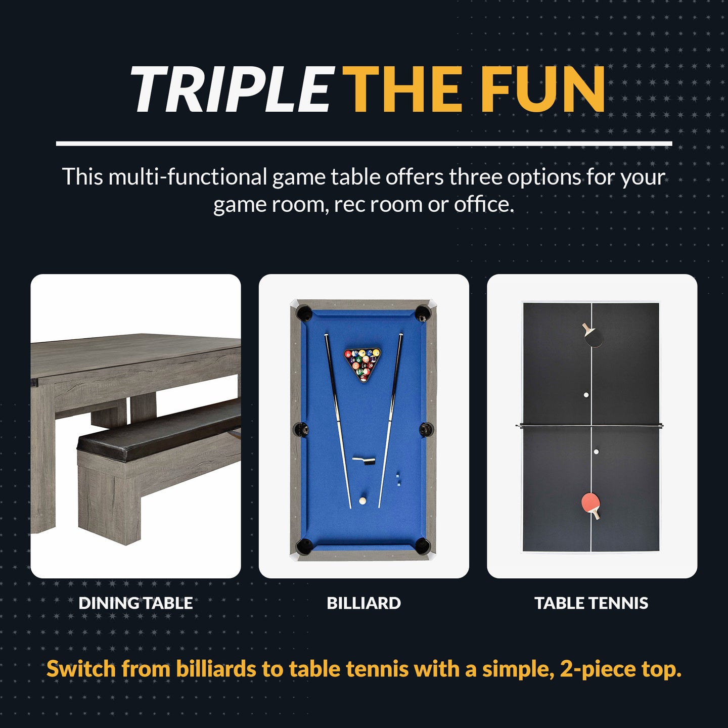 - TRIPLE THE FUN - This multi-functional game table offers three options for your game room, rec room or office. Switch from billiards to table tennis with a simple, 2-piece top. When it’s time for a break, flip the top for a handsome, dining surface.