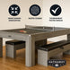 Premium features include 0.5-inch inlaid round sights, tournament-quality bumpers, a durable nylon and wool blended cloth, and chrome-plated corner caps. Easily convert the table into a dining or table tennis surface with the convenient 2-piece top. The matching benches keep your space organized and clutter-free while enjoying luxurious seating between rounds.