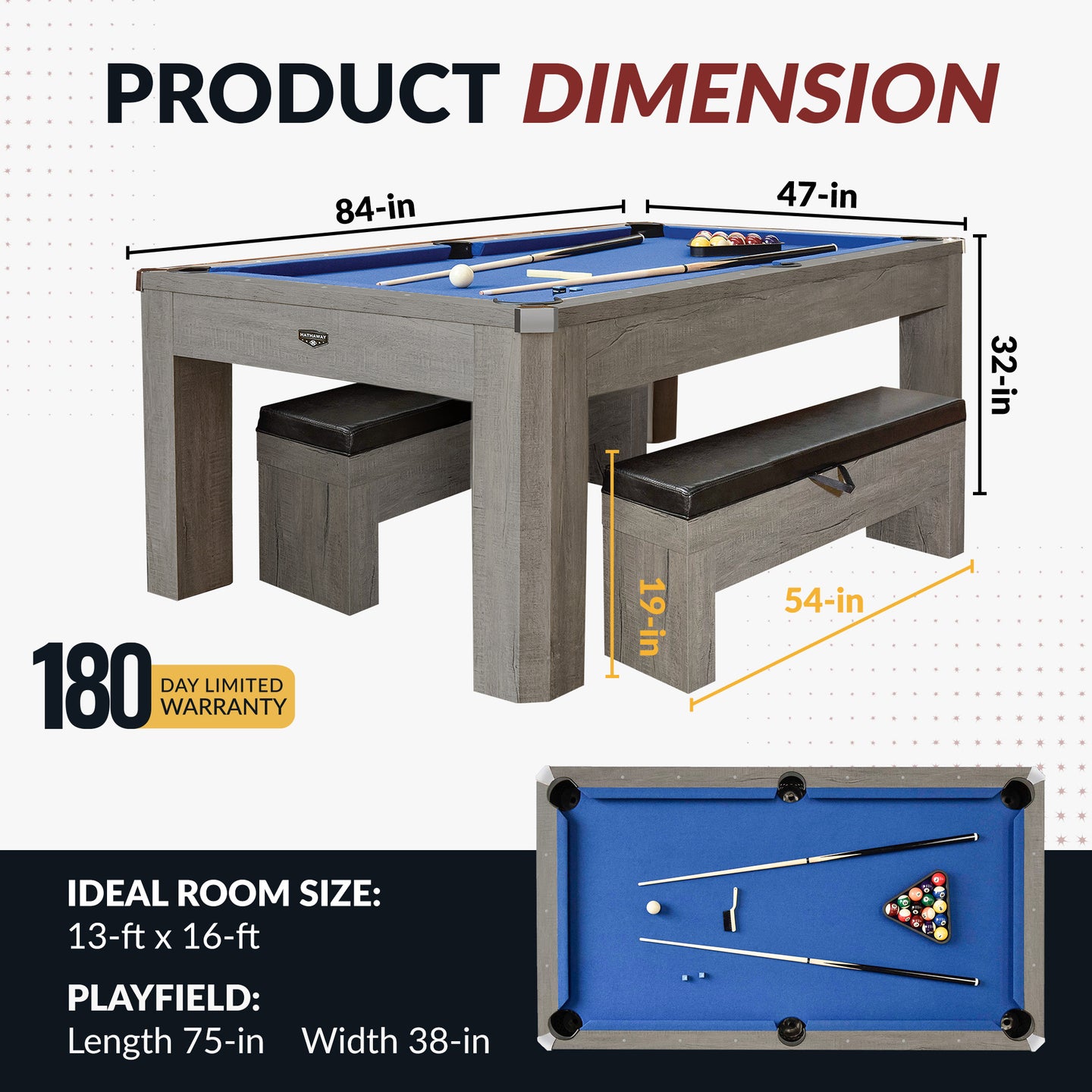 - Pool Table: 75-in (L) x 38-in (W) x 0.75-in (Thick)
