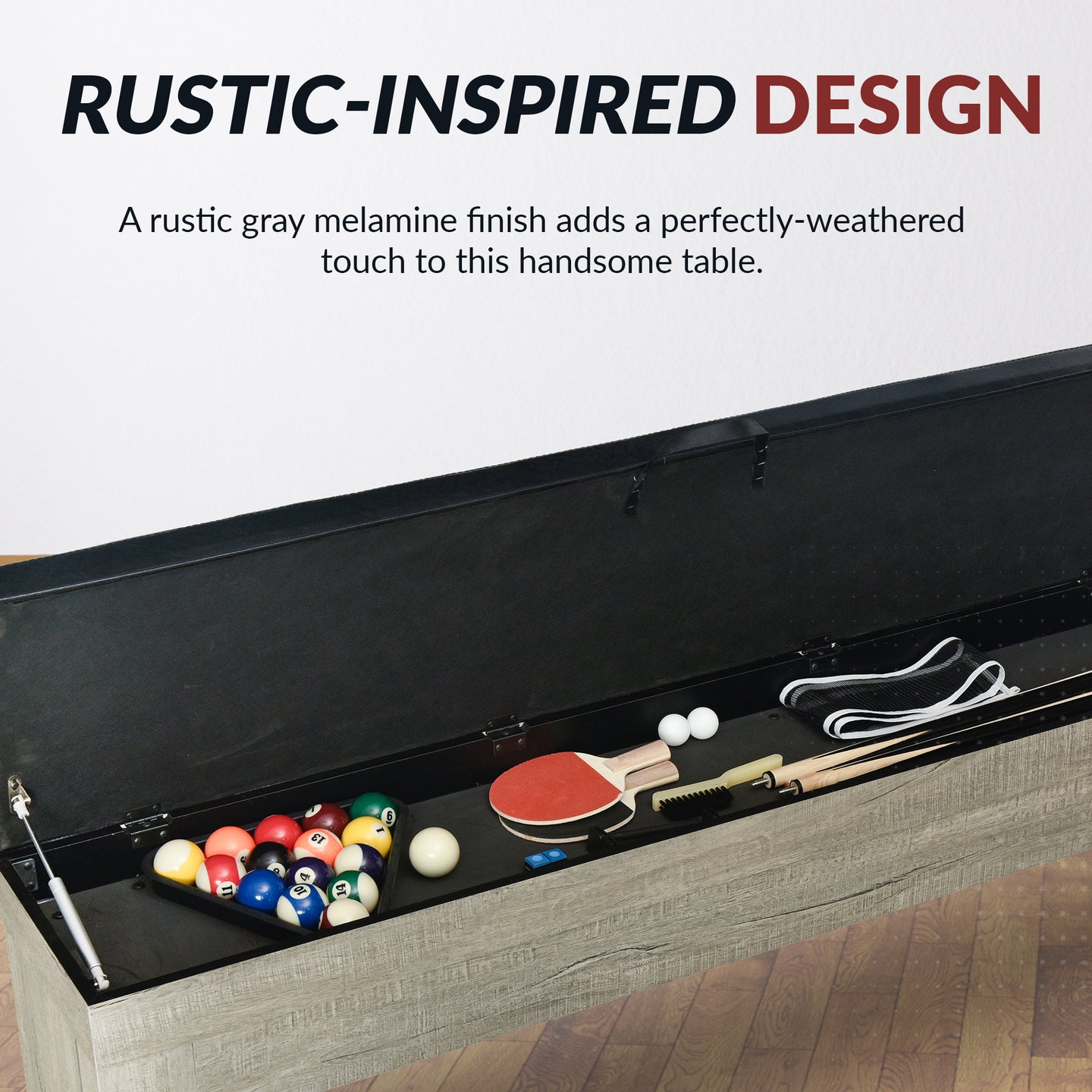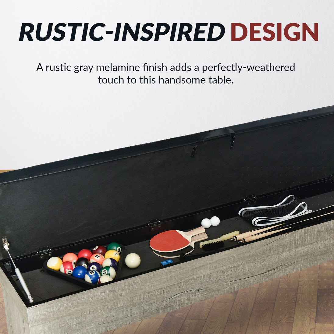 - RUSTIC-INSPIRED DESIGN - A rustic gray melamine finish adds a perfectly-weathered touch to this handsome table, allowing it to blend effortlessly with your décor. With classic, clean lines and a modern profile, this table makes a great centerpiece to your game room.