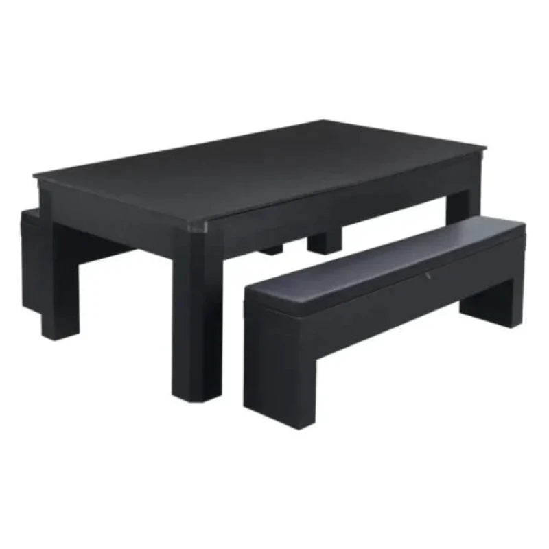 The pool table features a red wool blend felt over a smooth MDF playfield that delivers consistent ball roll and rebound, while the table tennis top lets you serve and volley whenever the mood hits. The matching benches hide handy storage space for cues, balls, paddles, and accessories, keeping everything organized and close by.