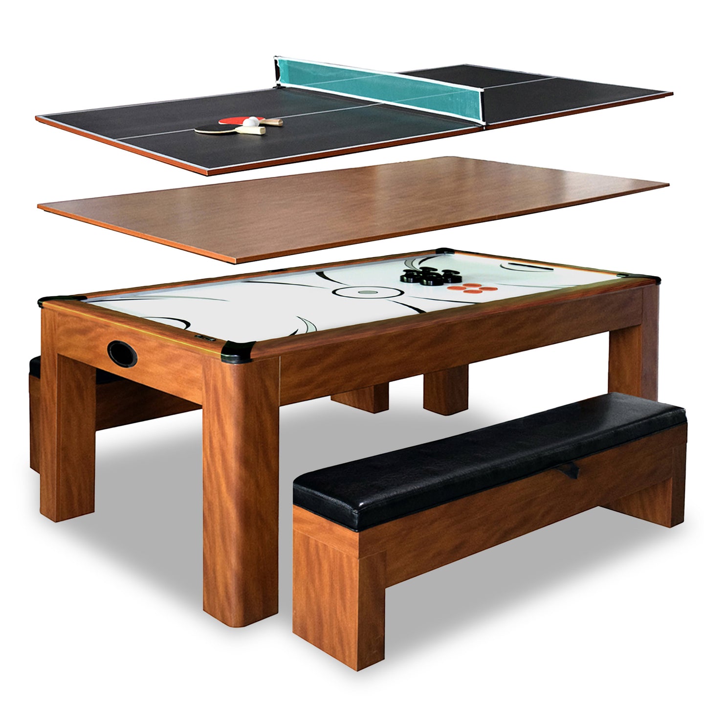 - FUN TO FUNCTION - Switching from fun to function is a snap with the Sherwood’s simple, removable tabletop. Easily change between air hockey, table tennis, or a convenient dining and game surface with a simple, 2-piece top.