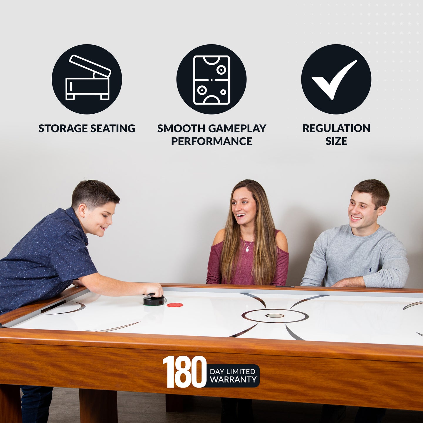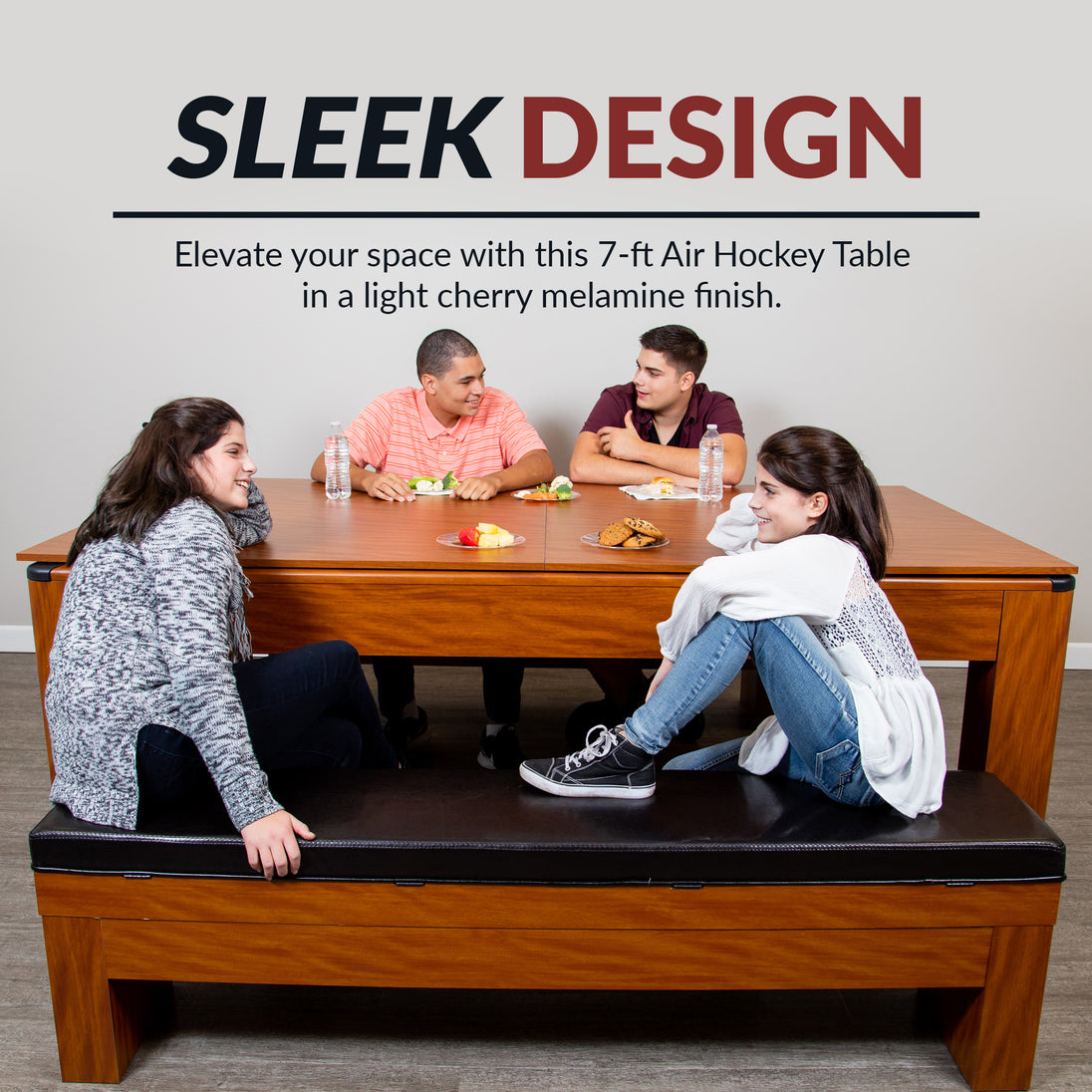 The handsome, multi-functional Sherwood Air Hockey Table is crafted from sturdy, CARB certified, MDF material featuring clean lines covered in a beautiful light Cherry melamine that showcases the rich grain of cherry wood. With its unique, in-rail, electronic scoring display, the Sherwood easily converts from a dining or craft table to a full-blown competitive table tennis or air hockey table. No raised scoring unit to get in the way! The poly-sealed play surface and competition air blower system delivers accurate air hockey table play. The Sherwood is designed and built to withstand vigorous table play. Includes matching benches with built-in storage and soft padded seat cushions that provide comfortable, convenient seating while keeping your game accessories close to the table and organized.